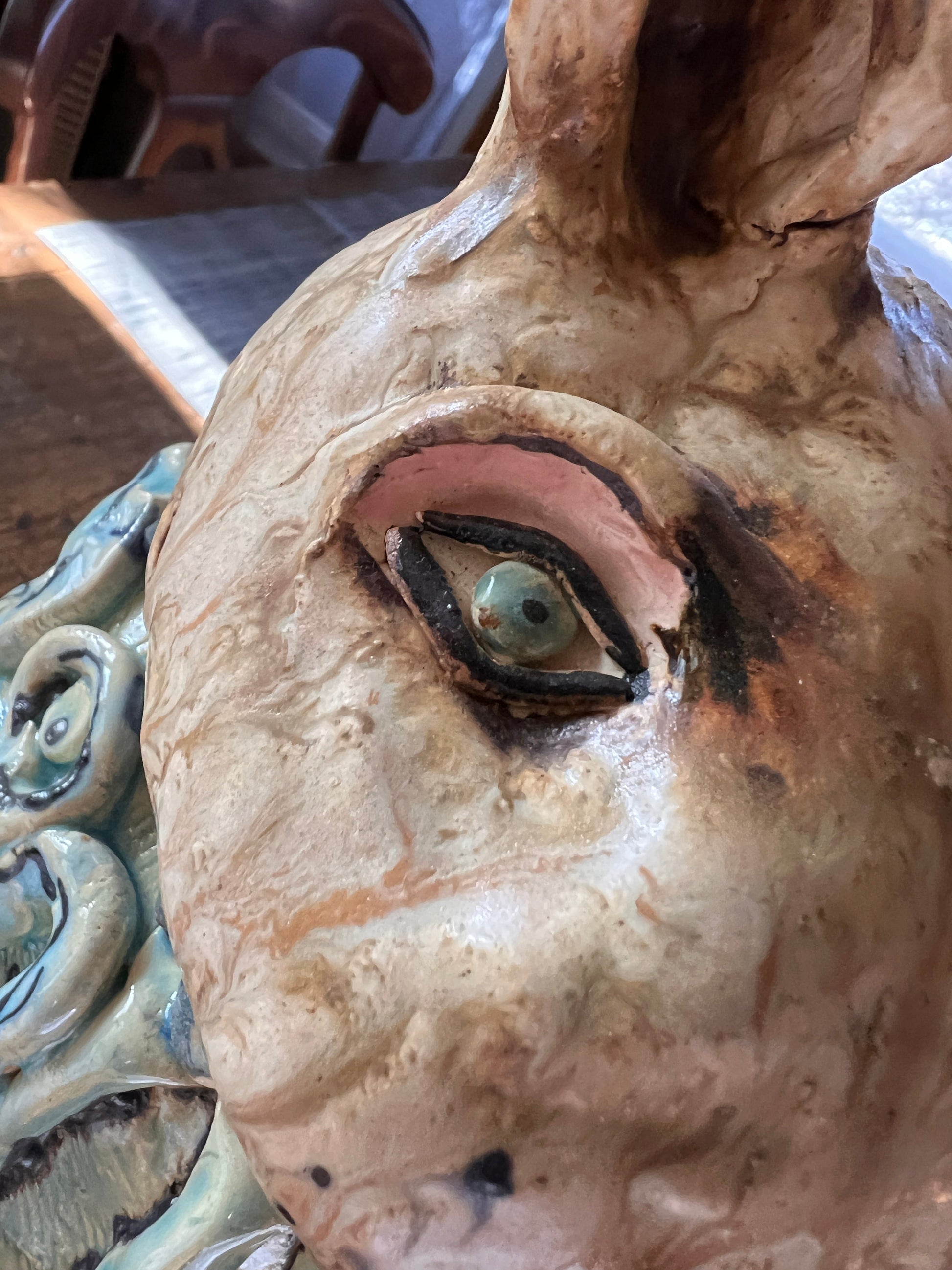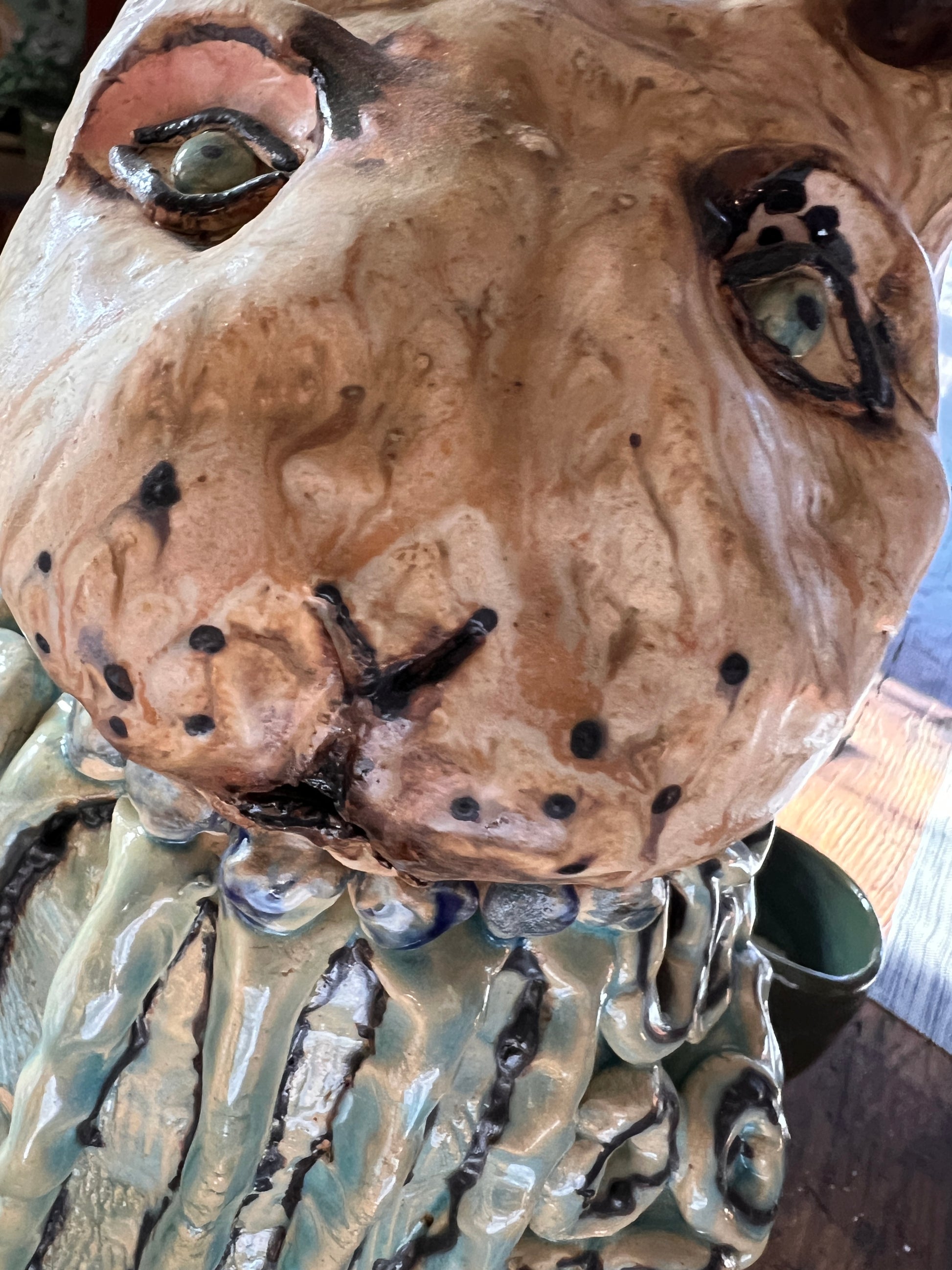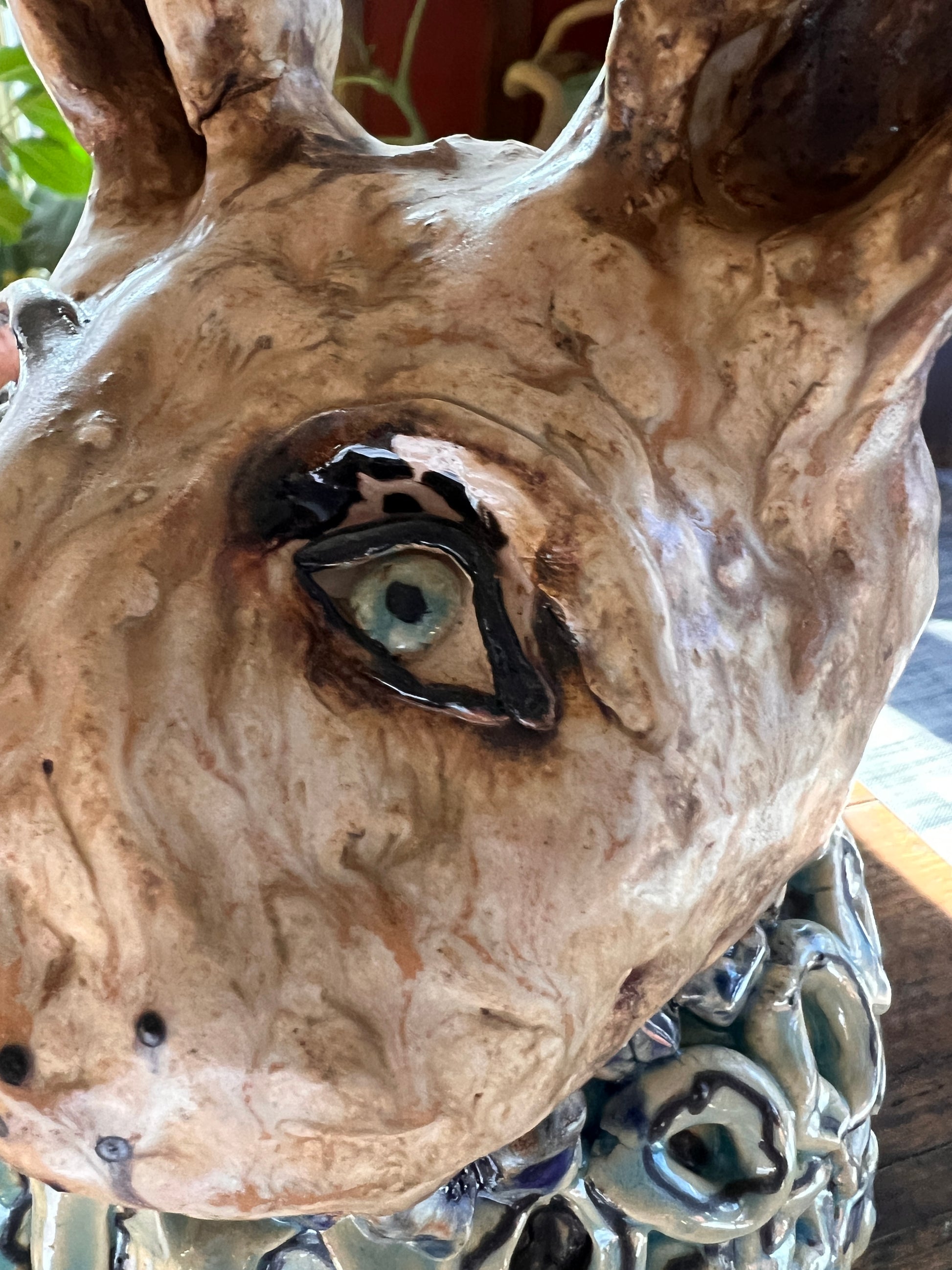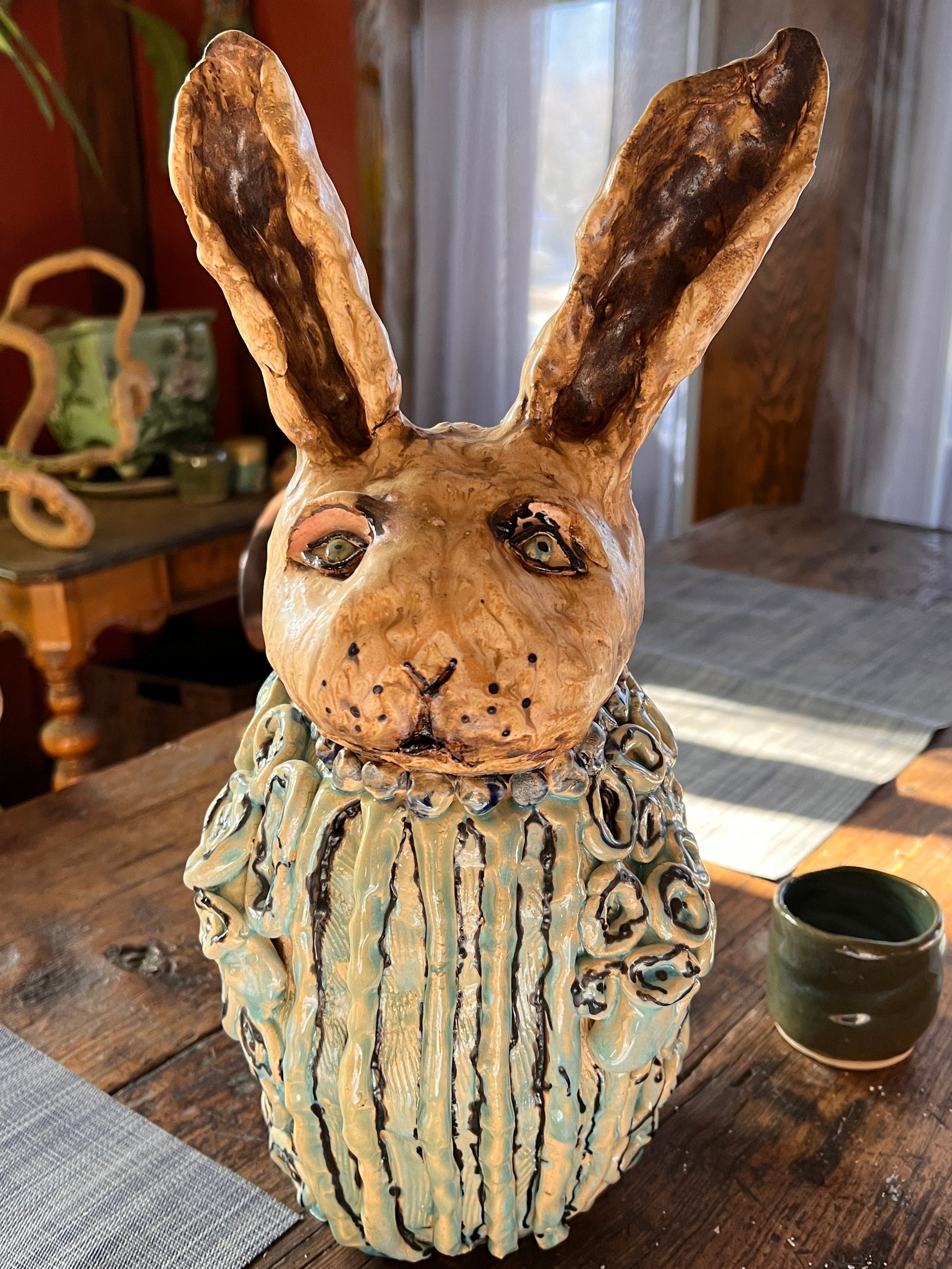 Circé lives in a sordid world of parties, soirees, and red carpet events. She loves discussing high fashion, affairs of the heart, and potential love interests. She's made of clay...fired to the optimum temperature and glazed with fairy dust and fabulous colors. She is approximately 16 inches tall and 9 inches wide. She wants to be seen so, high visibility is a must. This is a one of a kind sculpture and weighs about 12 pounds.